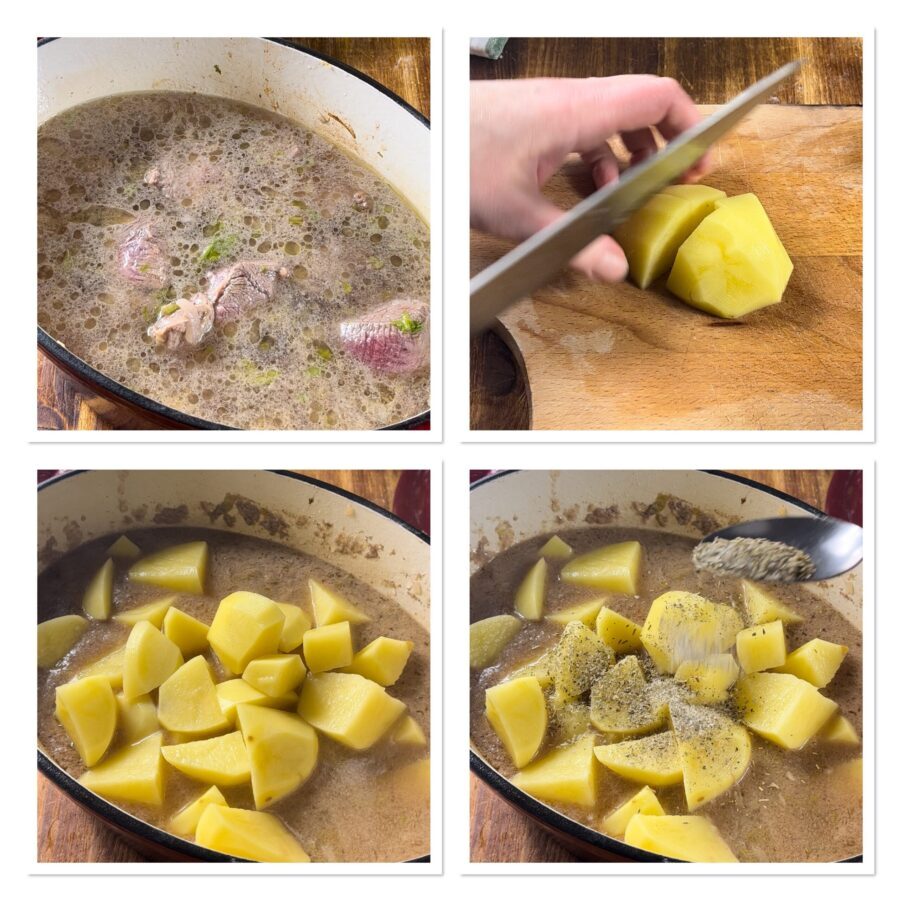 Mettez la casserole sur le feu, couvrez et laissez cuire pendant environ 2h30. Après ce temps, goûtez la viande et si elle est déjà tendre, pelez les pommes de terre, lavez-les et coupez-les en gros morceaux. Par exemple, une pomme de terre moyenne peut être coupée en quatre. Ajoutez les pommes de terre à la viande et n’ajoutez le mélange pour rôtis contenant déjà du sel que maintenant ; si nécessaire, ajoutez encore un peu d’eau.