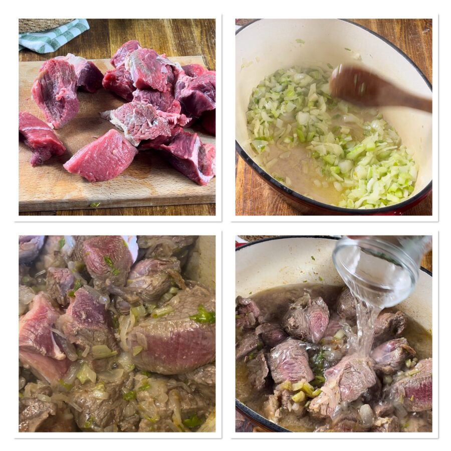 Ajoutez le ragoût, de préférence coupé en gros morceaux, faites-le dorer pendant 15 minutes en remuant de temps en temps et ajoutez un peu plus d’1 litre d’eau.