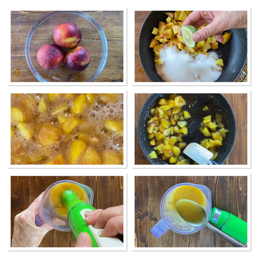 Fais tremper 4 g de gélatine en feuilles, essore-la, chauffe légèrement la compotée de pêches restante et ajoute la gélatine avec un peu d’eau chaude.