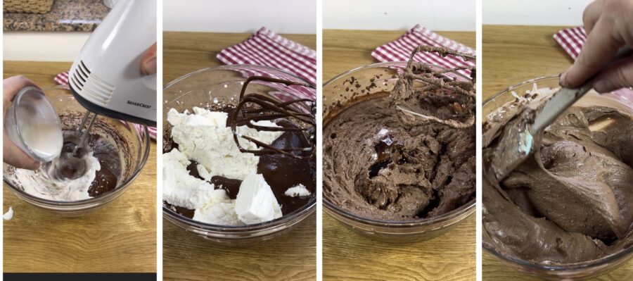 versez la crème en filet, incorporez-la puis ajoutez la ricotta. Travaillez jusqu’à obtenir un mélange mousseux, terminez par l’extrait de vanille et une pincée de sel.