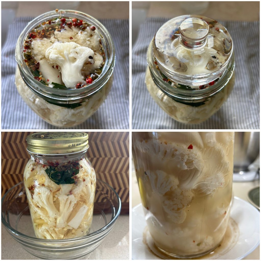 Prélevez l’eau, dissolvez-y complètement le sel puis versez la saumure dans le bocal en vous assurant que le chou-fleur reste toujours bien couvert par le liquide.