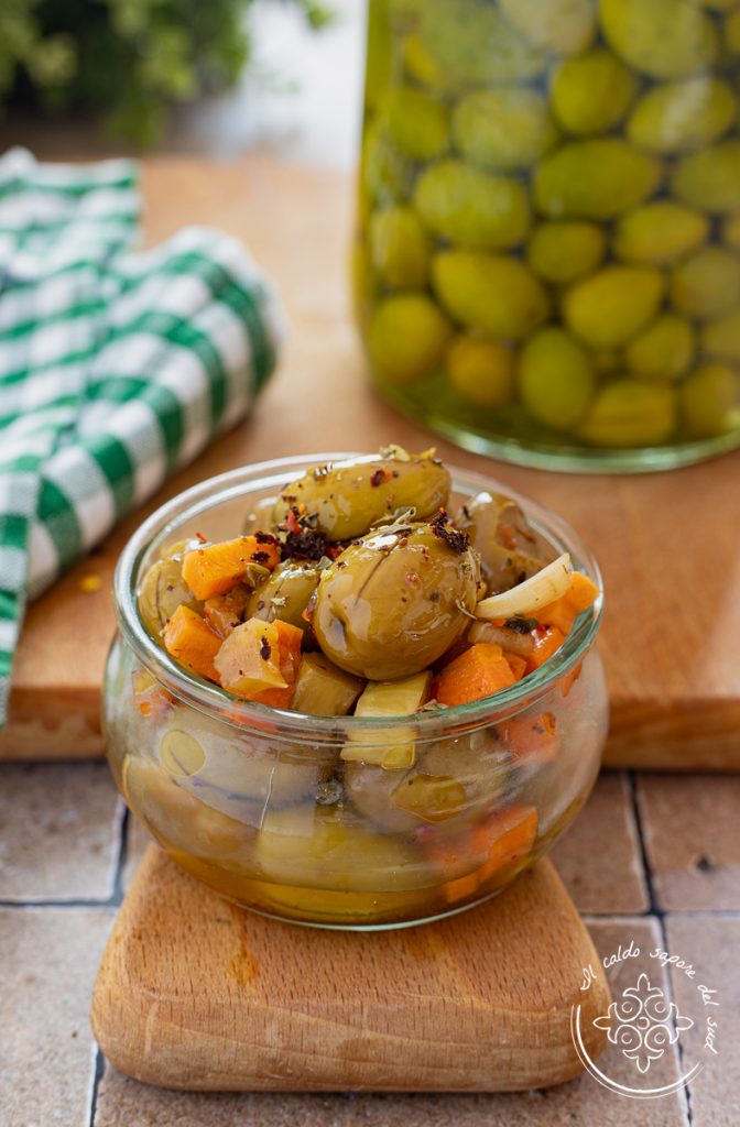 Aujourd’hui on découvre comment préparer des olives en saumure avec une méthode particulière : nous ferons des olives en saumure avec du sel, de l’eau, du vinaigre et de l’huile, une recette née pour conserver des olives écrasées et que j’utilise aussi pour les olives entières. Je vous ai déjà expliqué comment faire les olives écrasées, l’une des recettes de la cuisine sicilienne les plus emblématiques, comme les Olives noires rôties à la sicilienne, et je vous ai déjà dit que pour les préparer il faut changer l’eau tous les jours pendant au moins 10 jours. Avec cette deuxième recette, un peu plus « lente » que la première, je vous expliquerai comment obtenir des olives délicieuses sans le stress de devoir changer l’eau tous les jours ou de les écraser. Alors voilà, si vous voulez conserver les olives vertes fraîchement récoltées et en faire des réserves pour tout l’hiver, suivez-moi en cuisine et je vous expliquerai une recette super facile. Le seul inconvénient ? Il faudra attendre au moins trois mois avant de pouvoir les apprécier, car elles perdront leur amertume petit à petit et seront bonnes seulement en plein hiver. Cette conserve, grâce à l’utilisation de sel et vinaigre et à la fermentation qui se développe, évite le risque de botulisme (du moins tant que le bocal reste fermé).