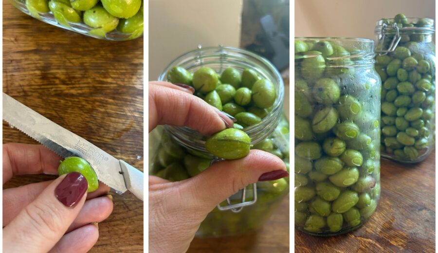 Cette recette a été conçue pour conserver longtemps les olives écrasées. Comme expliqué plus haut, pour les olives écrasées l’eau et le sel doivent être changés pendant une dizaine de jours et, une fois prêtes, les olives se conservent au réfrigérateur et se consomment relativement vite. Avec cette méthode, il ne faudra pas changer l’eau : les olives s’adouciront avec le temps et vous pourrez les conserver longtemps (tant que le bocal reste fermé). Dans ma version, j’ai évité d’écraser les olives et me suis contentée de les inciser : le résultat est identique.
