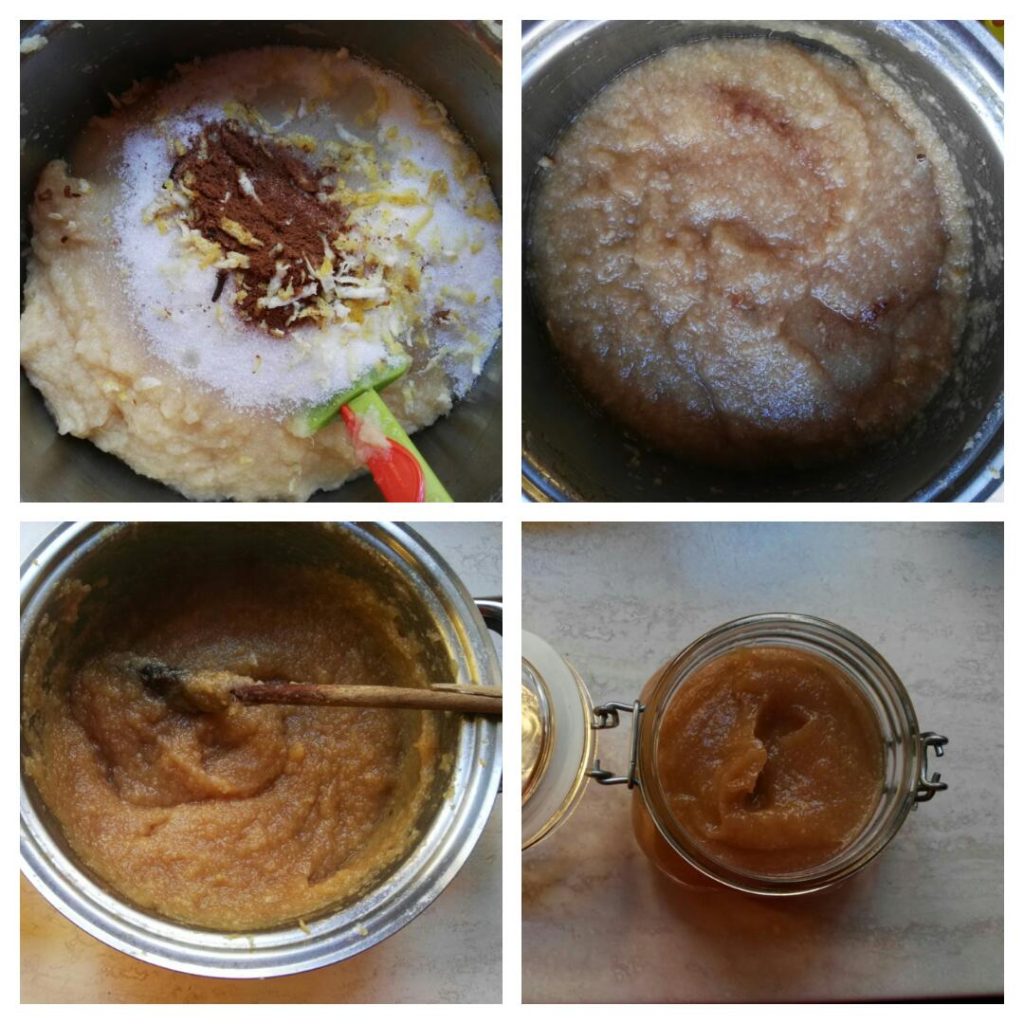 • Ajoutez l’équivalent de la moitié du poids en sucre : j’en ai mis 500 g pour environ 1 kg de purée. Ajoutez la cannelle en poudre, les clous de girofle, le zeste râpé d’un citron et la moitié du jus.