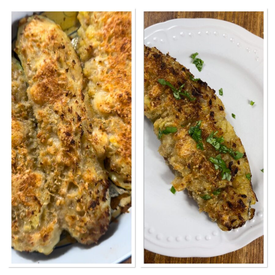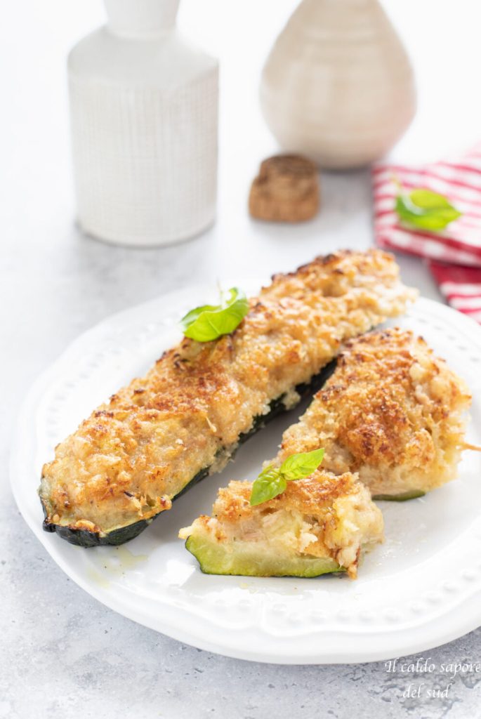 J’adore les courgettes au four farcies et sans viande ; je les prépare de mille façons, par exemple l’autre jour j’ai fait des Courgettes farcies végétariennes au riz et au fromage, et cette fois je les ai garnies de pommes de terre et de thon, sans œufs. Oui, je suis adepte du « sans ceci ou sans cela », parce que quand il manque un ingrédient à la maison, je ne m’arrête pas : je me débrouille et, avec ce que j’ai, je prépare souvent, en dépensant peu, des recettes vraiment savoureuses !