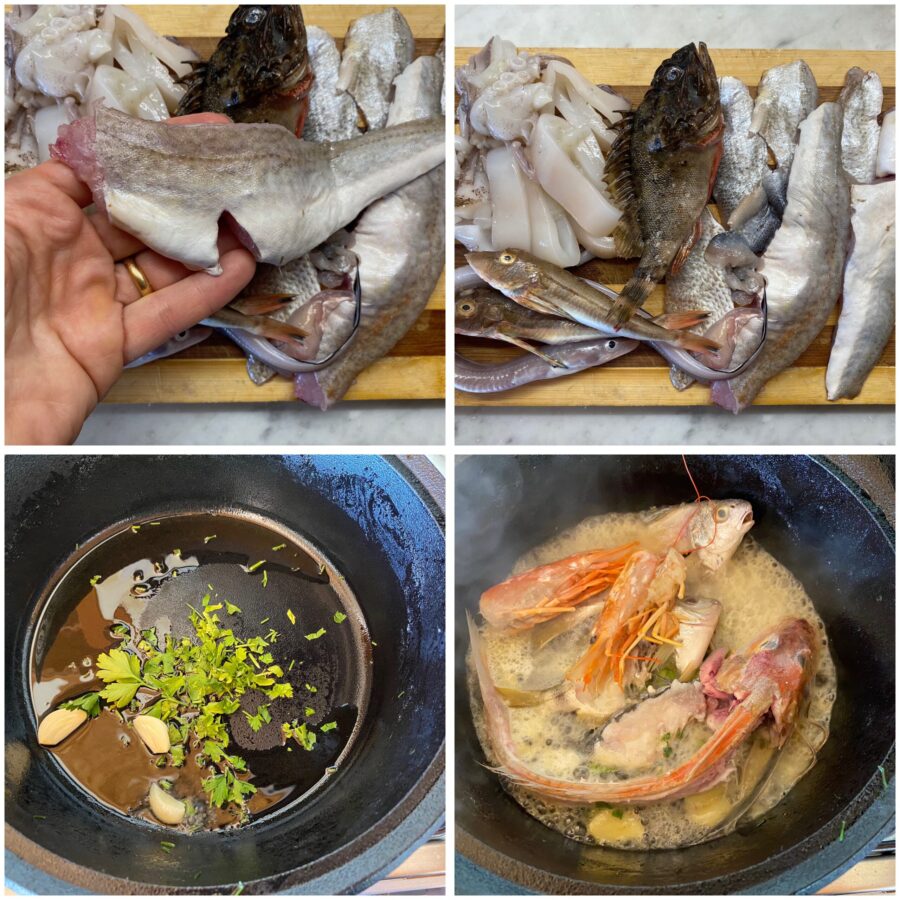 Portez à ébullition et rectifiez l’assaisonnement.Ajoutez au bouillon bouillant le poisson filetés et les poissons à soupe nettoyés, attendez environ 5 minutes puis ajoutez les calamars.