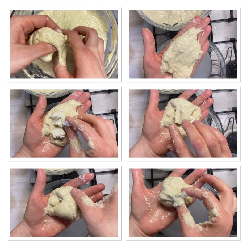 Si vous avez un robot pâtissier, pétrissez jusqu’à ce que la pâte soit élastique, homogène et assez liée, même si elle reste très fluide.