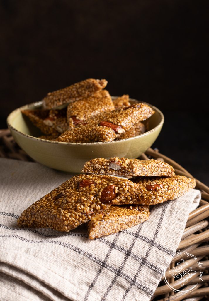 Le nougat au sésame se conserve parfaitement pendant plusieurs jours. Évitez de le placer au réfrigérateur ou dans des endroits humides, car l’humidité pourrait altérer sa texture, le rendant collant et moins croustillant.