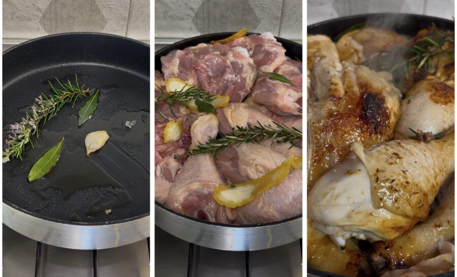 Déposez dans une poêle la gousse d’ail non pelée et écrasée, le romarin (celui de la marinade) et deux feuilles de laurier, versez juste un filet d’huile et faites chauffer. Déposez la viande dans la poêle avec les zestes de citron et le reste des aromates, mais conservez le liquide de la marinade. Laissez bien dorer la viande d’un côté puis de l’autre, jusqu’à former une croûte dorée ; cette étape est importante pour notre recette, donc faites en sorte qu’elle prenne de la couleur.