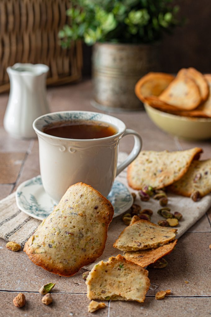 Les feuilles de thé à la pistache de Zafferana, comme les feuilles de thé aux amandes, sont des biscuits typiques de la cuisine sicilienne traditionnelle : de petites douceurs nées dans le village au pied de l’Etna vers les années 50 du XXᵉ siècle, créées par le pâtissier Alfio Salemi, propriétaire de la pâtisserie éponyme. Elles font partie de la cuisine locale aux côtés des tout aussi célèbres Siciliane fritte con tuma e acciughe. Ce sont des biscuits extrêmement fins et délicats, réalisés à partir d’une pâte fluide semblable à celle utilisée pour les gaufres pour glace maison, qui s’étalent lentement au four pour créer des formes irrégulières et légères. Dans ces biscuits, les pistaches hachées au couteau restent visibles et apportent parfum et finesse. Dorées sur les bords et plus claires au centre, les feuilles de thé de Zafferana sont des biscuits secs à conserver, parfaits à déguster avec le thé, un vin doux ou comme dessert en fin de repas. Une recette simple, faite d’ingrédients modestes, qui raconte la pâtisserie traditionnelle de Zafferana Etnea et les cuisines familiales. Aujourd’hui, préparons ensemble les feuilles de thé : vous verrez que les biscuits à la pistache de Zafferana sont faciles à réaliser, très savoureux et, comme les originaux, friables et délicats. Suivez-moi en cuisine ; préparons ensemble ces biscuits fins à la pistache de Zafferana, et si vous souhaitez rester informé(e) de toutes mes recettes, vous pouvez suivre ma page Facebook (ici) et mon profil Instagram (ici).