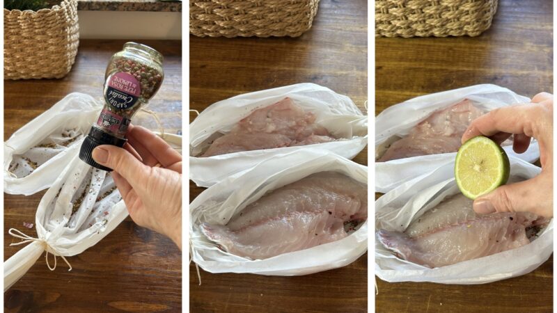 Répartissez deux demi-tours de Pepe Rosa & Limone La Drogheria 1880, en vous aidant du moulin intégré dans le conditionnement, sur chacune des papillotes, puis déposez les filets.