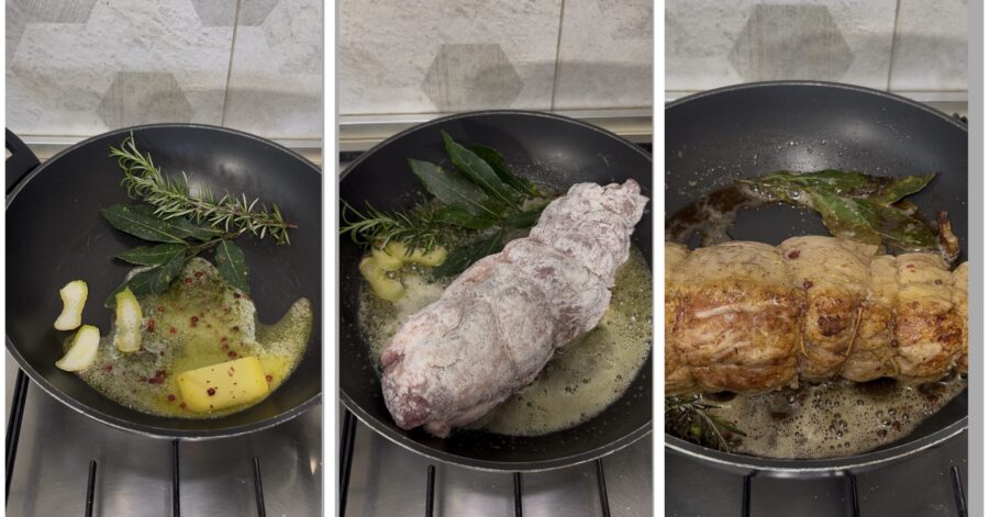 Après avoir acheté le filet mignon de porc entier, ficelez-le avec de la ficelle de cuisine (ce n’est pas indispensable mais cela vous aidera à conserver sa forme) et passez-le dans la farine, en veillant à ce qu’elle adhère bien de tous les côtés, puis réservez un instant. Faites fondre délicatement le beurre dans la poêle,
