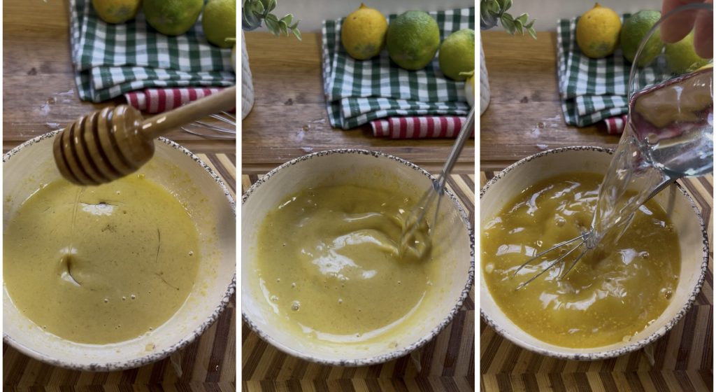Pendant ce temps, recueillez le jus de citron dans un bol, ajoutez la moutarde, le miel, un peu d’eau, le sel et mélangez.