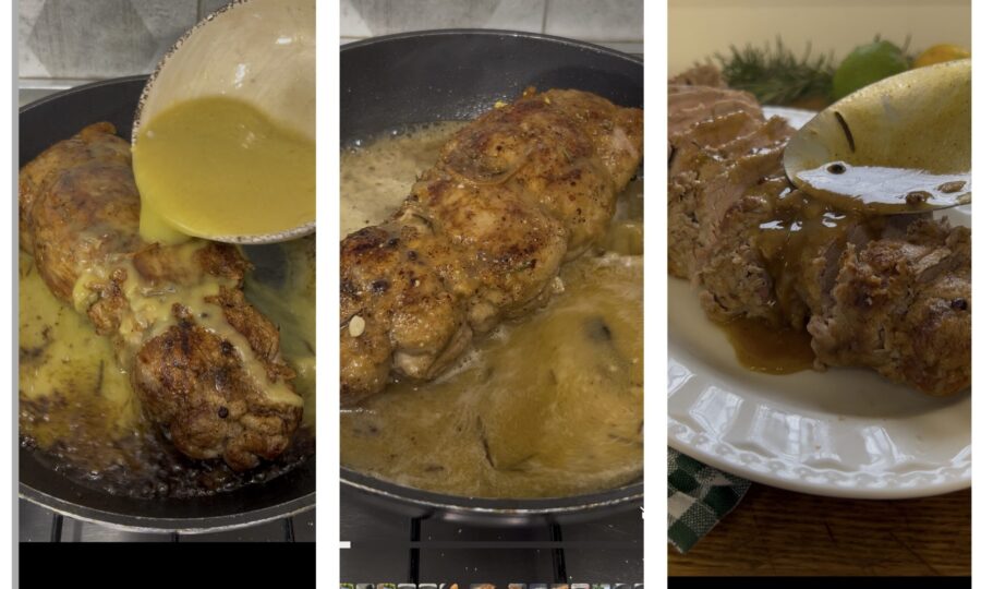 Versez ce mélange sur le filet et faites cuire 35 minutes à feu modéré, en l’arrosant avec le jus de cuisson qui va peu à peu s’épaissir. Si vous avez un thermomètre de cuisine, mesurez la température au cœur : elle ne doit pas dépasser 70°C, ni être inférieure à 65°C. Je préfère une cuisson rosée (pas crue) à 65°C, la viande reste ainsi tendre et juteuse.