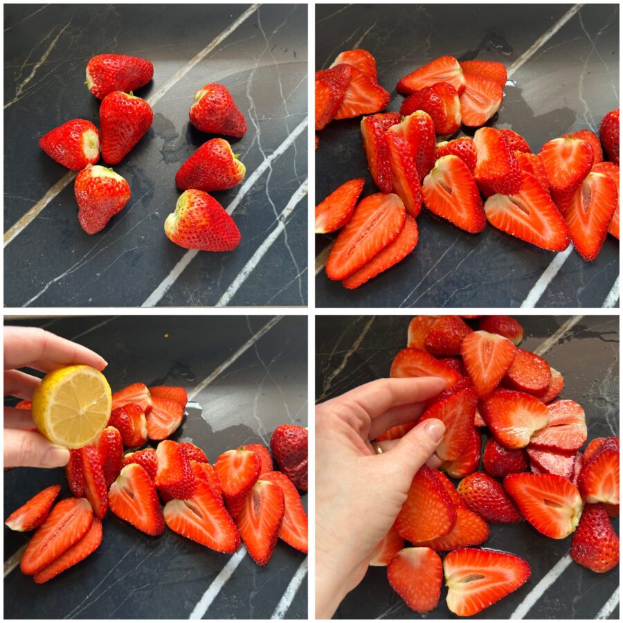 Pour préparer les fraises séchées, commence par les laver sous l’eau courante et les sécher soigneusement, en douceur. Enlève le pédoncule et coupe-les en tranches d’environ 2-3 mm d’épaisseur, pas plus. Évite les tranches trop fines et essaie de les garder à peu près de la même épaisseur : c’est un petit détail mais ça fera la différence à la cuisson.