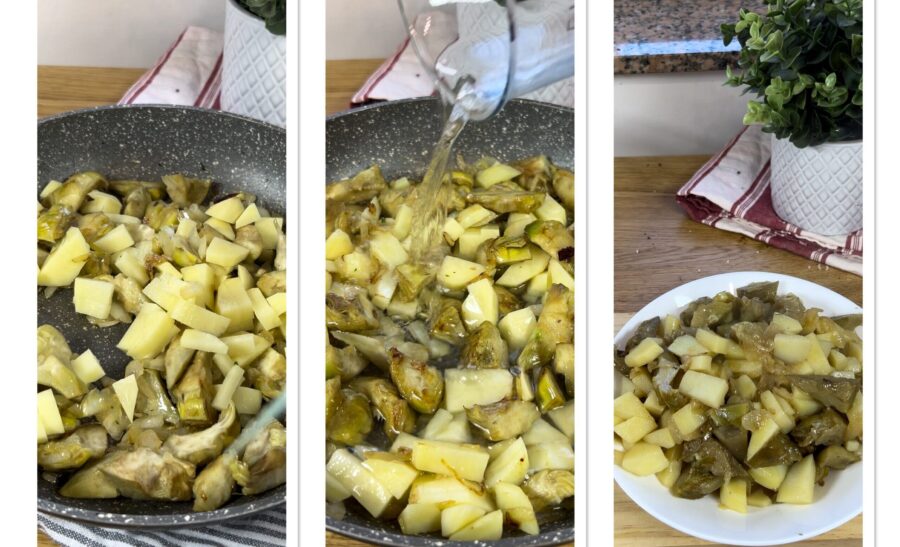 • puis ajoutez-les aux artichauts et aux oignons et laissez encore prendre le goût. Versez un peu d’eau et terminez la cuisson, en cuisant jusqu’à ce que les pommes de terre et les artichauts soient tendres.