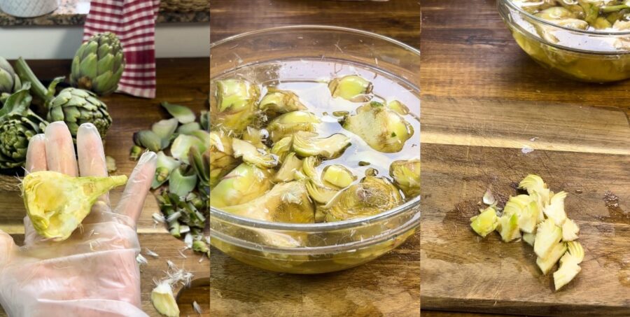 • Au fur et à mesure que vous procédez, déposez les cœurs dans un bol d’eau acidulée (avec du jus de citron ou du vinaigre), l’acidité empêchera qu’ils noircissent. Une fois tous les cœurs prêts, tranchez-les.