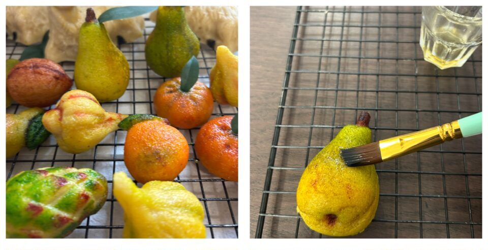 En décorant avec un aérographe, la frutta martorana sera plus lisse et moins rugueuse. En décorant avec des couleurs diluées dans l’eau, l’effet ressemblera davantage à une photo