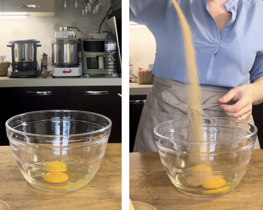 • Montez les œufs au fouet en ajoutant progressivement le sucre,