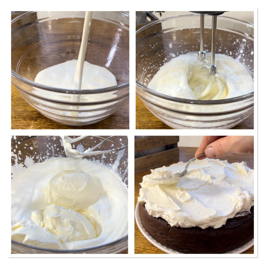 • Montez la crème jusqu’à ce qu’elle soit mousseuse et épaisse, mais pas trop ferme, ajoutez le mascarpone et continuez à fouetter. Incorporez le fromage à tartiner et le sucre puis mélangez encore au fouet.