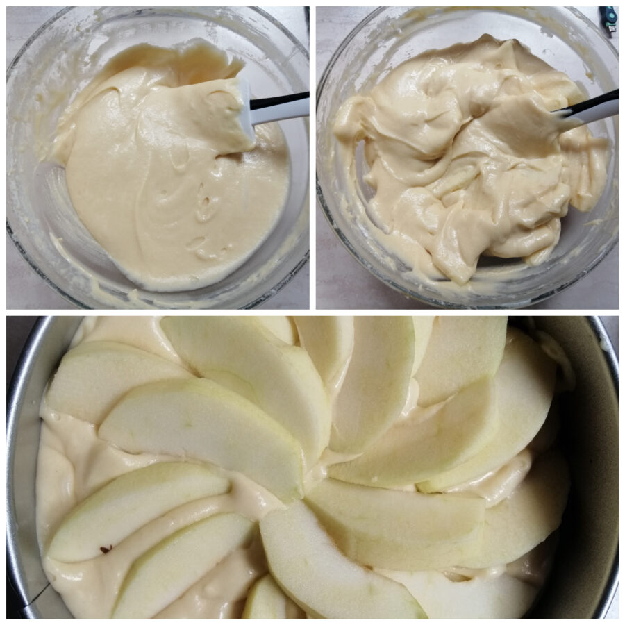 Épluchez les deux pommes, coupez-en une en petits dés et ajoutez-la à la pâte avec la vanilline et la levure, coupez l’autre en quartiers d’environ un demi-centimètre d’épaisseur.