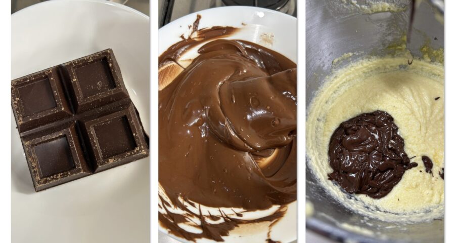 • Faites fondre le chocolat au bain‑marie et ajoutez‑le au mélange,