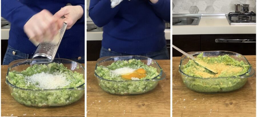 Mélangez la préparation, ajoutez une bonne quantité de fromage râpé, le sel, les œufs et la chapelure, juste ce qu’il faut pour obtenir une préparation ferme et pas trop humide.