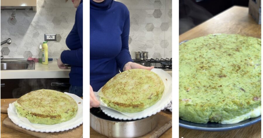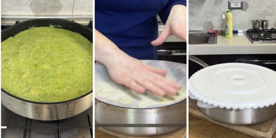 Faites cuire à feu très doux avec le couvercle sur une plaque moyenne pendant 15 minutes. Au terme de la cuisson, étalez une grande feuille de papier cuisson sur la tarte et, avec un peu de force et l’aide d’une assiette de la bonne taille, retournez la poêle pour transférer le contenu dans l’assiette.