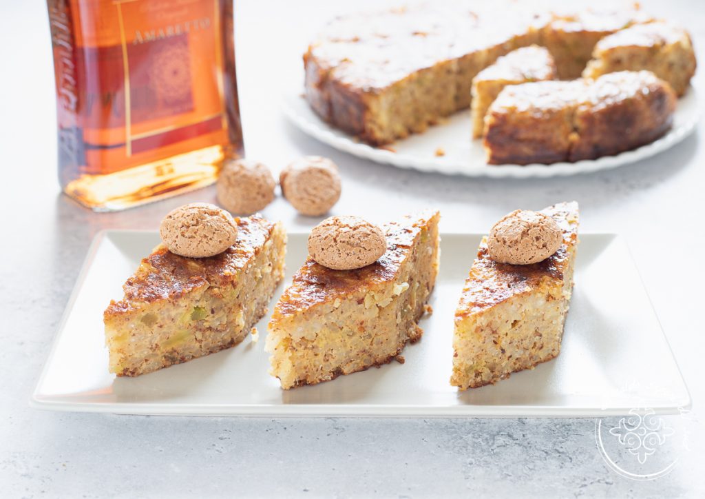 Sortez du four et, encore chaud, piquez tout le gâteau avec un couteau et arrosez généreusement d’amaretto, afin de bien l’imbiber.