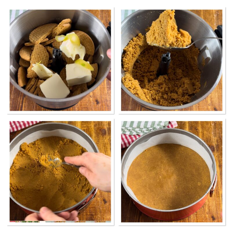 Mixez les biscuits (vous pouvez utiliser des Digestive, des biscuits secs ou des sablés ordinaires, mais sachez que les biscuits secs demandent un peu plus de beurre) avec le beurre et travaillez jusqu’à obtenir un mélange ressemblant à du sable humide.