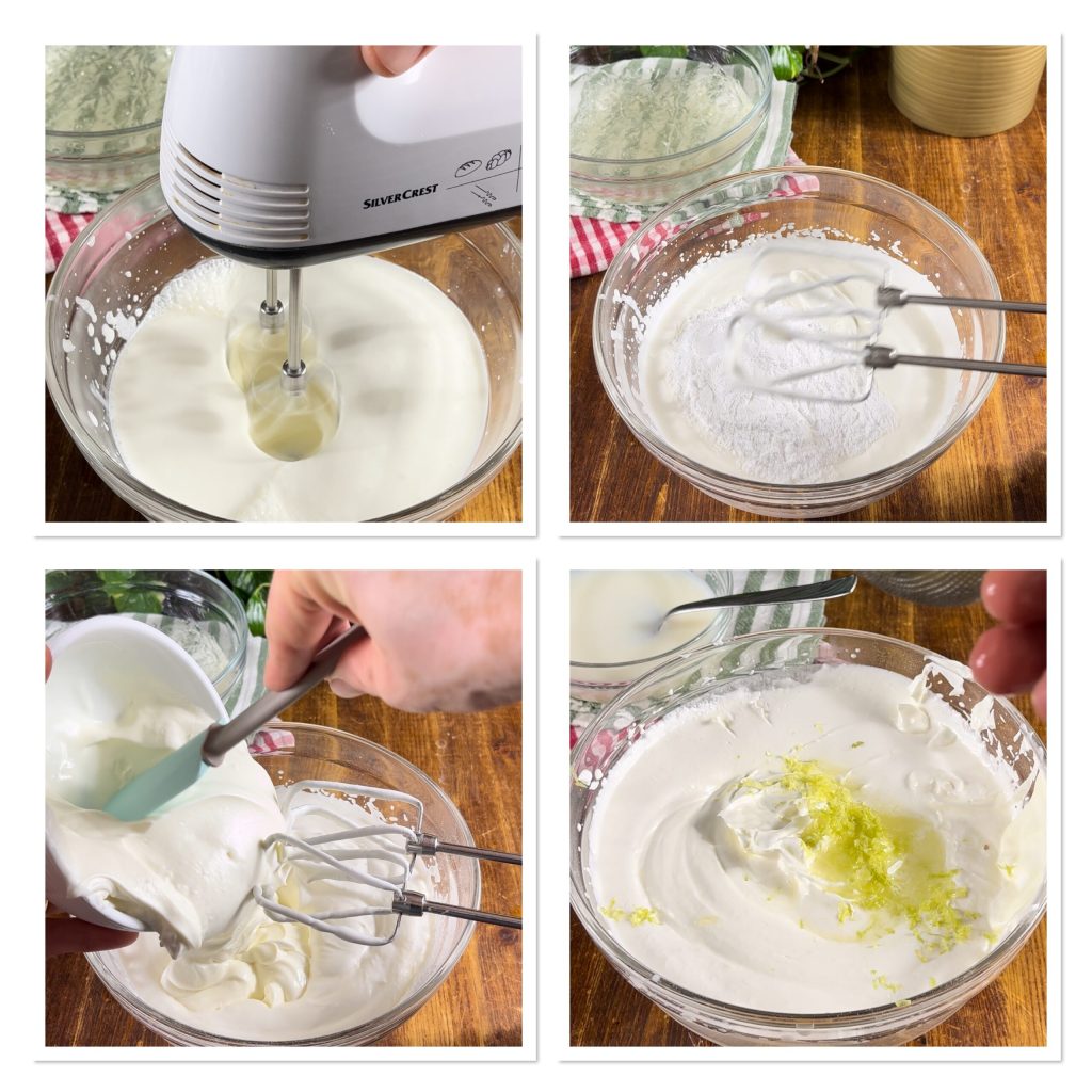 • Montez la crème froide dans un bol froid, ajoutez le sucre glace puis le yaourt. Ajoutez le zeste de citron, le jus et l’extrait de vanille.