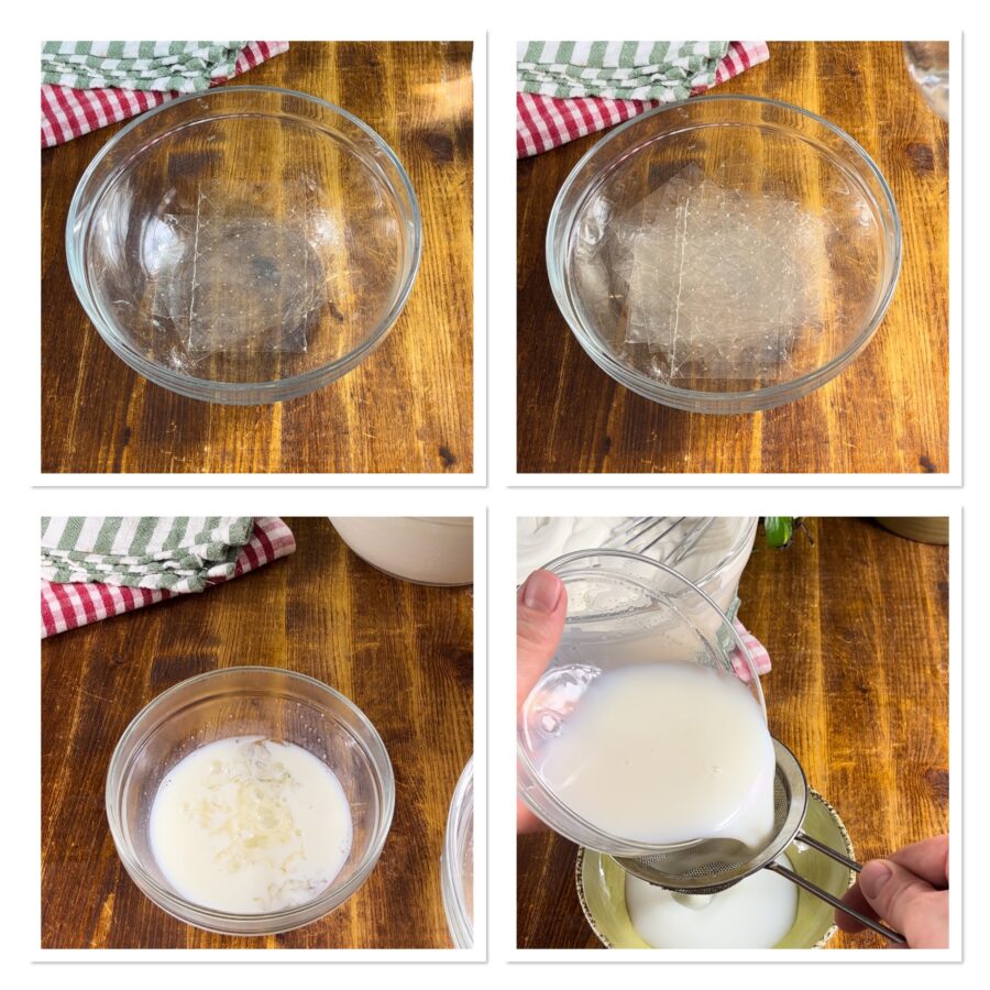 • Faites ramollir la gélatine en feuilles dans de l’eau froide et laissez-la bien se réhydrater. Chauffez le lait, essorez la gélatine et dissolvez-la dedans, filtrez avec une passoire puis incorporez-la à la mousse de crème et de yaourt en mélangeant rapidement avec une spatule ou un fouet à main.