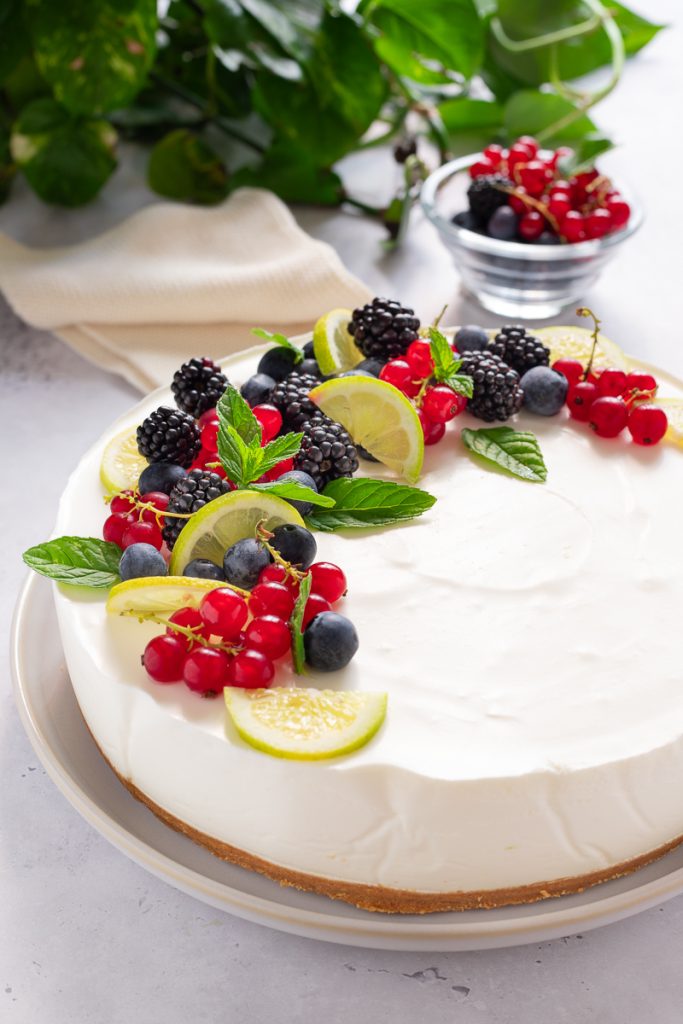 Garnissez-le avec les fruits des bois, les feuilles de menthe, les tranches de citron et servez : le gâteau froid au yaourt est prêt.