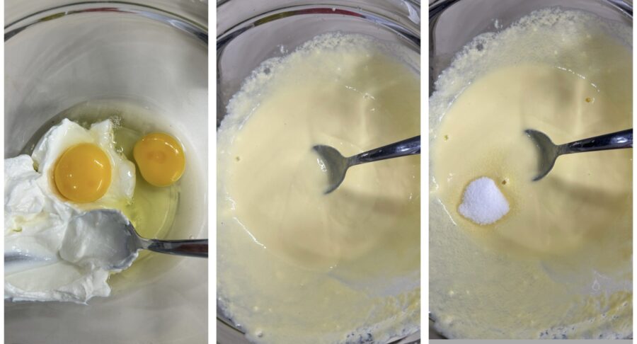 Pendant ce temps, travaillez les oeufs avec la crème aigre ou le yaourt (chez nous, la crème aigre se trouve difficilement), ajoutez le sucre et mélangez ; une fourchette suffira.