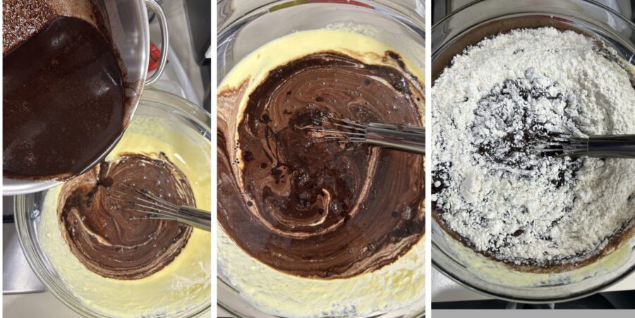 Ajoutez le liquide cacao-bière et mélangez, puis incorporez la farine. Travaillez avec le fouet à la main jusqu’à obtenir une préparation homogène et terminez