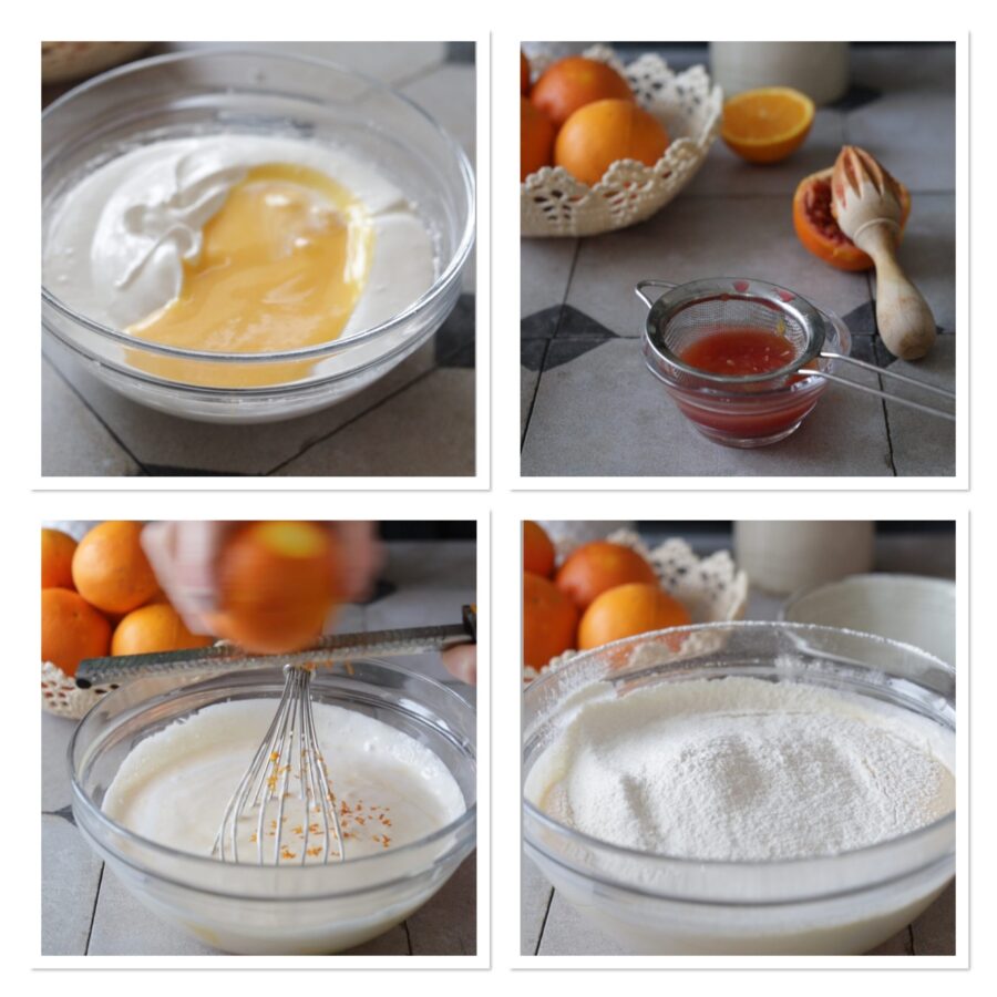 • Versez le mélange de jaunes, beurre et sucre sur les blancs montés, incorporez, ajoutez 40 ml de jus d’orange et son zeste, puis incorporez la farine tamisée et mélangez.