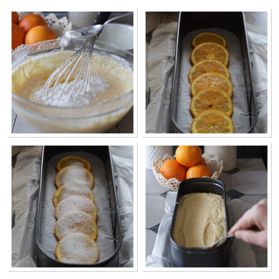 • Ajoutez la levure, le sucre vanillé ou l’essence de vanille et l’arôme d’orange, mélangez. Tranchez une orange en fines rondelles, recouvrez le fond d’un moule à cake de 26 cm de papier cuisson, disposez les tranches d’orange, saupoudrez de sucre et versez la préparation.