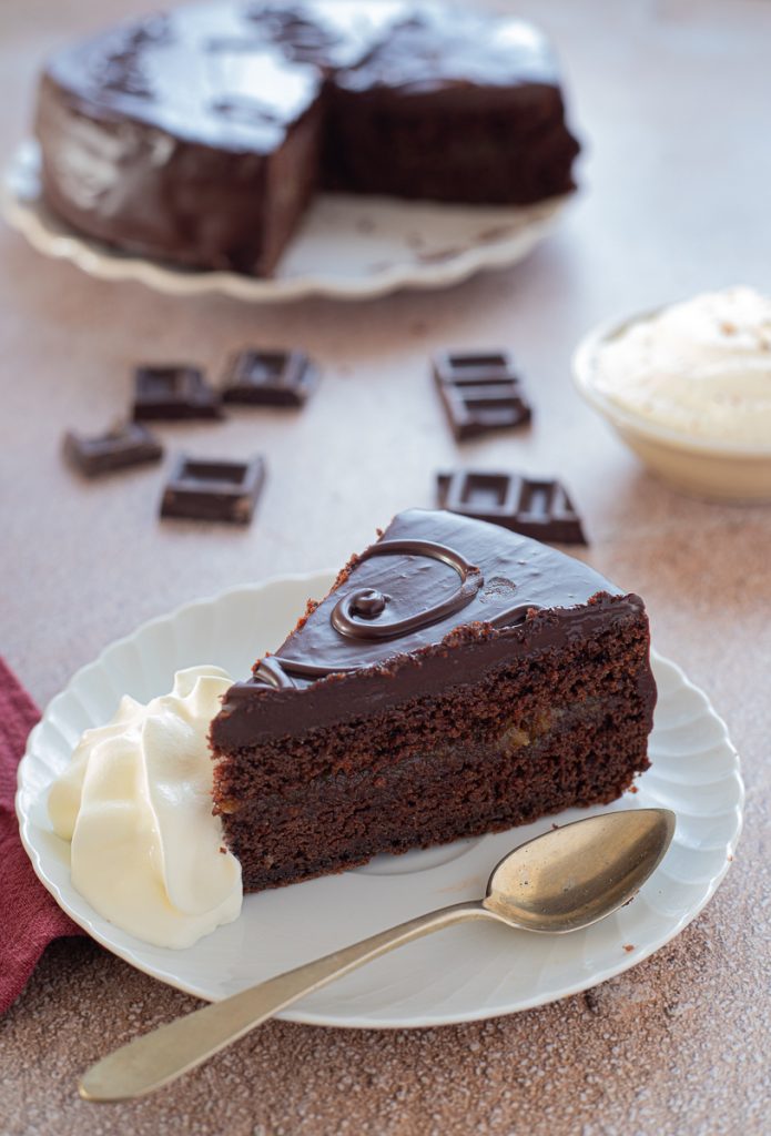 La vraie recette de la sachertorte est un secret jalousement gardé par la pâtisserie viennoise Sacher, mais au fil du temps beaucoup ont tenté de créer des desserts inspirés par cette douceur et puisque je l’ai goûtée personnellement, je peux dire sans problème que ma recette est même un peu meilleure que l’originale. Aujourd’hui je la partage avec vous et vous verrez que cette version, délicate, moelleuse et crémeuse, pas du tout écoeurante et vraiment gourmande, vous séduira, et si vous voulez la servir avec une boule de glace à la crème comme à Vienne, vous l’aimerez encore plus!!