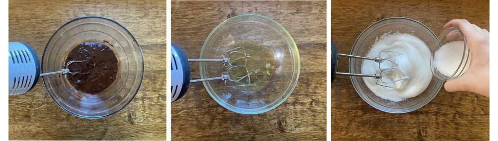 Dans un bol séparé, montez les blancs en neige bien ferme, ajoutez le sel puis incorporez le reste du sucre petit à petit. Continuez de monter jusqu’à obtenir une masse soutenue.