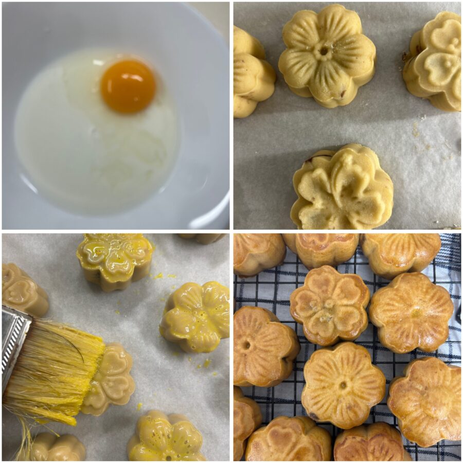 Procédez ainsi jusqu’à former tous les gâteaux lunaires et enfournez-les dans un four statique à 170°C pendant 10 minutes, juste pour faire sécher le motif. Sortez‑les, laissez‑les tiédir et badigeonnez‑les avec un œuf battu mélangé à 3 cuillères de lait. Ne le faites pas lorsqu’ils sont encore chauds, car vous abîmeriez le décor. Remettez au four 10 à 15 minutes supplémentaires ou jusqu’à ce qu’ils aient une belle couleur ambrée et soient brillants juste comme il faut.