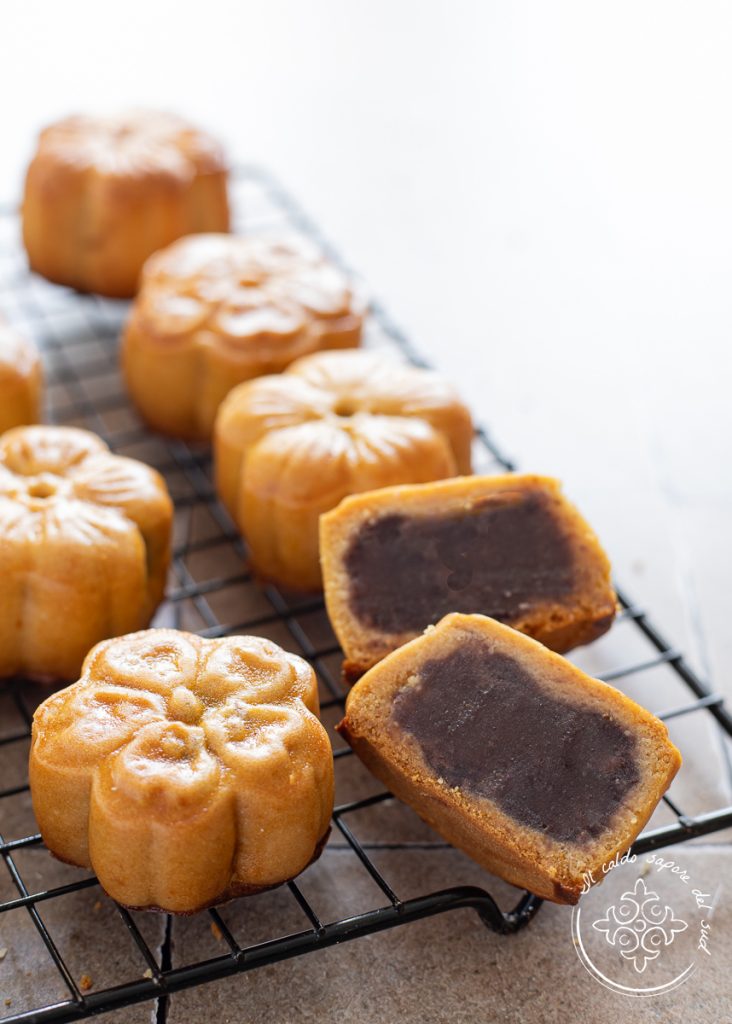 Gâteaux de la lune ou mooncakes. Le mooncake est une pâtisserie d’origine chinoise, traditionnellement consommée pendant la Fête de la mi‑automne et à l’occasion des autres grandes fêtes du calendrier, comme le Nouvel An lunaire, qui cette année tombe le mercredi 29 janvier 2025. Il y a quelque temps, si vous vous en souvenez, je vous ai raconté comment préparer l’anko, la fameuse confiture de haricots azuki, la même que nous avons utilisée pour garnir les mochi aux haricots rouges (japonais) ou les dorayaki aux haricots rouges, et je vous avais aussi dit qu’elle nous servirait pour d’autres préparations. En voici une : les gâteaux lunaires fourrés à la confiture de haricots. Je veux être sincère : j’ai acheté le moule juste par curiosité il y a plusieurs mois, sans l’utiliser, et en réalité il n’est pas tout à fait authentique, car le vrai moule devrait avoir des caractères chinois porte-bonheur gravés. Mais on va passer outre, et comme la recette des gâteaux lunaires me tentait déjà depuis longtemps, pour éviter de la préparer hors saison, ces jours-ci, où tombe le Nouvel An chinois, je me suis lancée avec le moule que j’avais déjà : ça va très bien, le goût ne change pas ! 😉