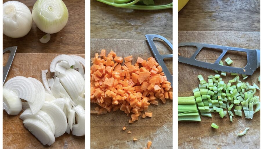 Pour préparer la sauce genovese à la napolitaine, commencez par éplucher, rincer et émincer les oignons. Ensuite, épluchez le céleri et les carottes et coupez-les en petits dés pour obtenir un hachis. Réservez quelques feuilles de céleri.