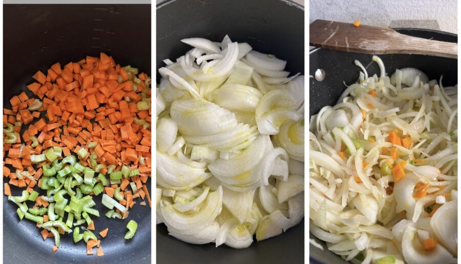 Rassemblez tous les légumes dans une casserole à fond épais et versez un généreux filet d’huile. Laissez suer à feu moyen, jusqu’à ce que les oignons aient un peu réduit de volume.