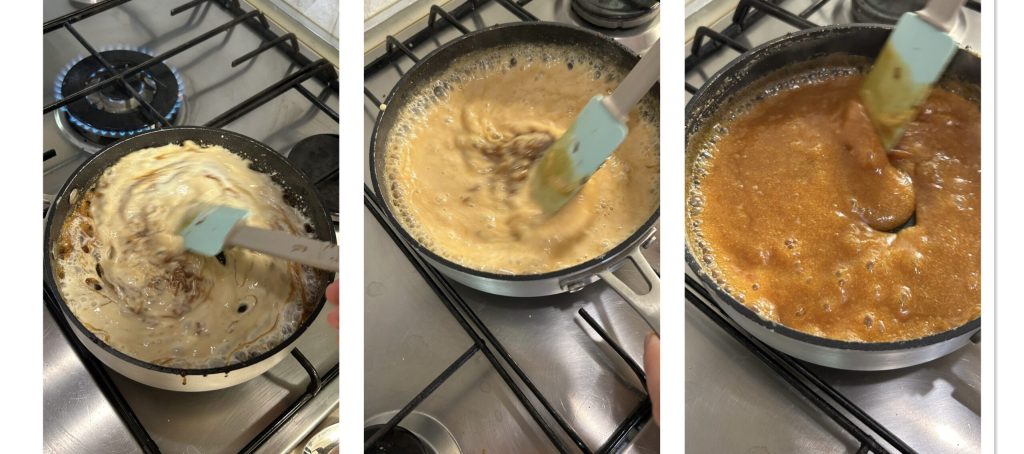 Continuez à remuer jusqu’à obtenir une sauce dense et ambrée, mais faites vraiment très attention à ne pas vous brûler avec le sucre fondu (il colle à la peau) et à ne pas brûler le caramel, sinon il deviendrait amer.