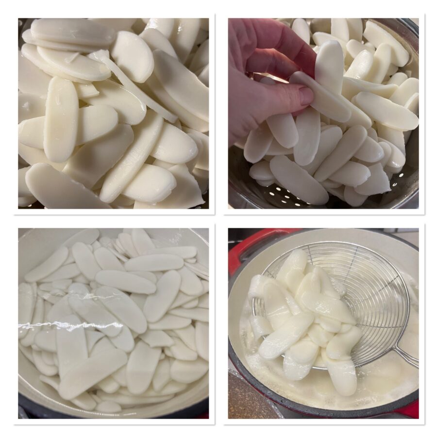 Si vous utilisez des gnocchis secs, voici comment les faire tremper : après avoir acheté les gnocchis de riz secs, rincez-les abondamment sous l’eau courante, rassemblez-les dans un bol et couvrez-les d’eau froide. Laissez-les reposer 12 h, égouttez-les, rincez-les et répétez le trempage pendant encore 12 heures. Si après cela ils sont devenus tendres, vous pourrez les utiliser ; sinon prolongez encore le trempage jusqu’à parfaite réhydratation. Une fois réhydratés, faites bouillir une grande casserole d’eau légèrement salée et plongez-y les gnocchis. Dès qu’ils remontent à la surface, vous pouvez les utiliser et les ajouter directement aux légumes déjà cuits.