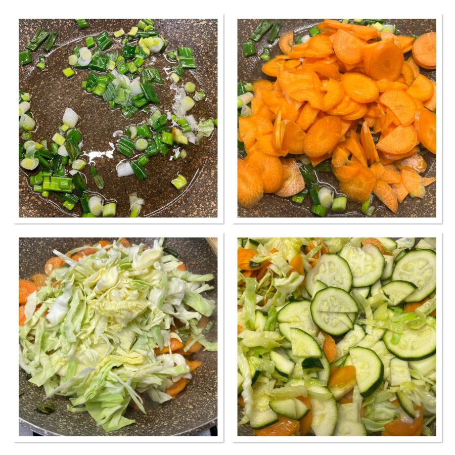 Pour préparer les gnocchis de riz à la poêle, il faut préparer les légumes : nettoyez les oignons nouveaux et faites-les sauter dans la poêle avec l’huile, ajoutez les carottes pelées et coupées finement, puis le chou pommé également finement émincé, et après encore 5 minutes, les courgettes coupées.