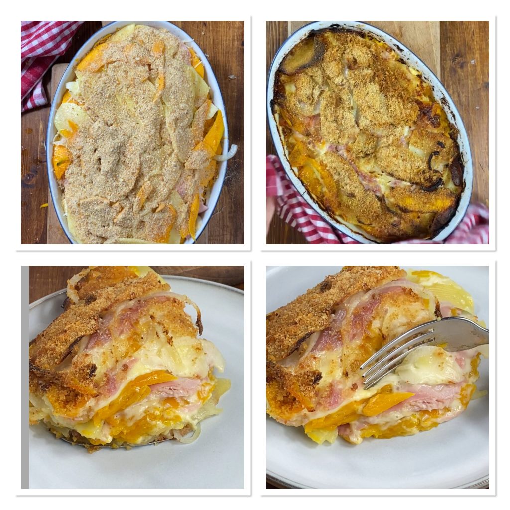 Répartissez de la chapelure au fond d’un grand plat, réalisez une fine couche de pommes de terre et d’oignon, une autre couche avec la courge, puis parsemez de fromage râpé, de fromage en tranches et de jambon cuit.