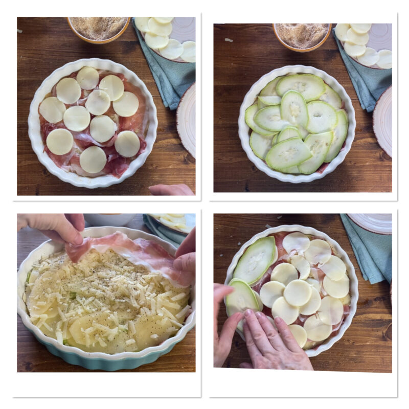 Couvrez d’une couche de courgettes et répétez avec une couche de pommes de terre.