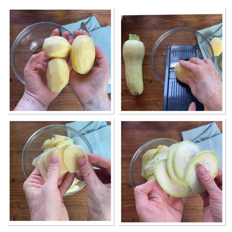 Épluchez et tranchez les pommes de terre, retirez l’extrémité inférieure de la courgette et tranchez-la également.