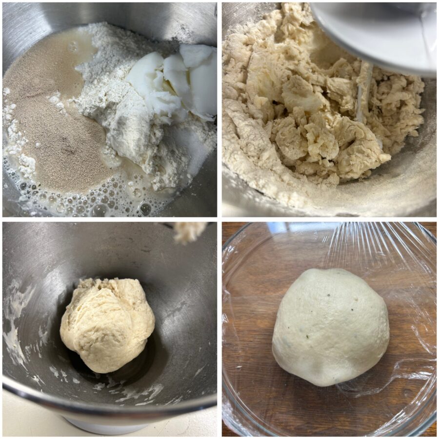 Formez une boule avec la pâte, placez-la dans un saladier légèrement huilé, couvrez de film alimentaire et laissez lever dans un endroit tiède jusqu’au doublement du volume.